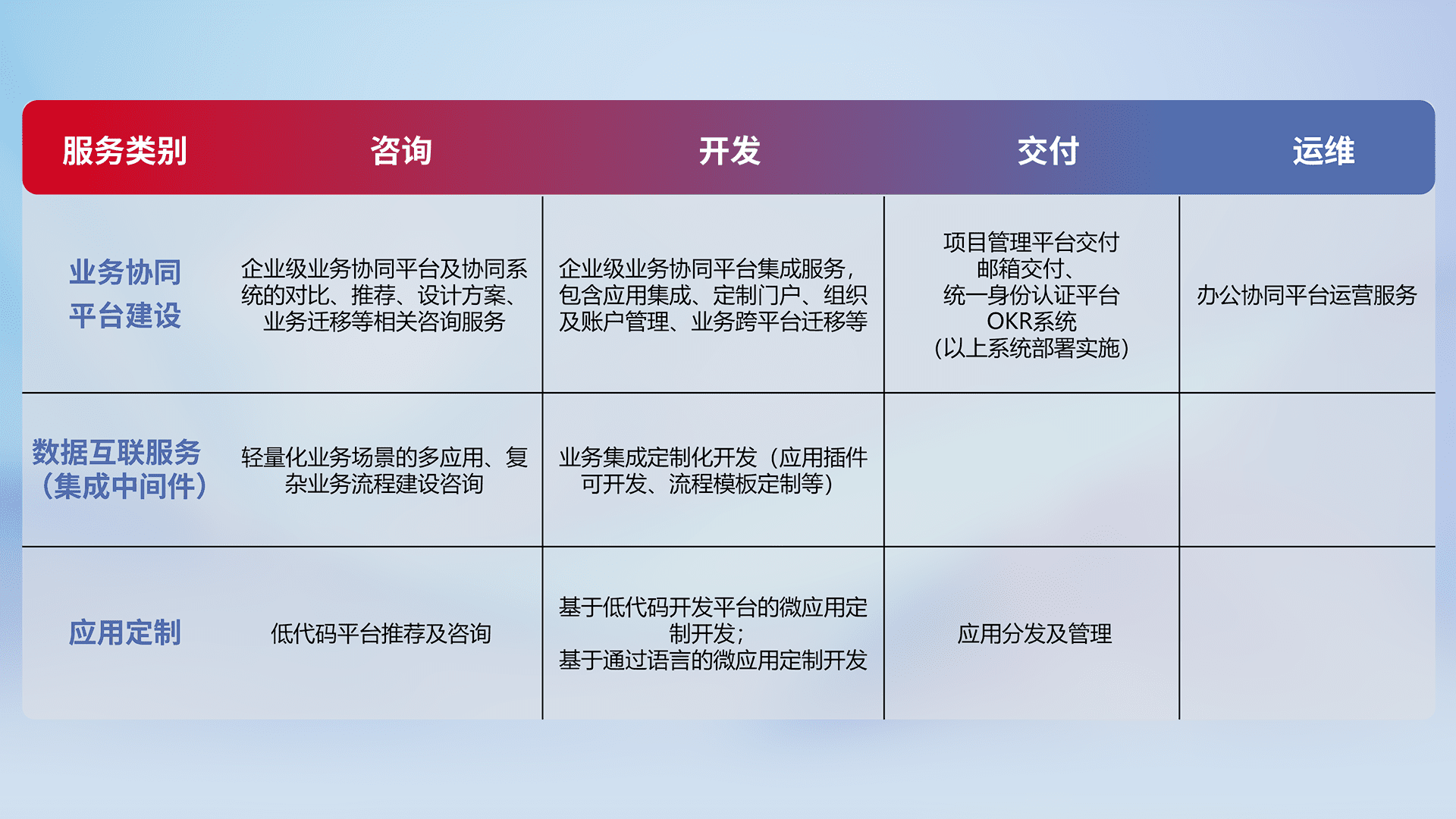 针对钉钉、、企微、、IDaas等平台级产品提供产品的规划、、、、方案、、交付、、定制化开发等服务,,,实现如统一协同办公、、智能客户服务、、、、混合会议管理、、、、智能数据查询、、、等业务场景,,,,实现数字化转型。。。。