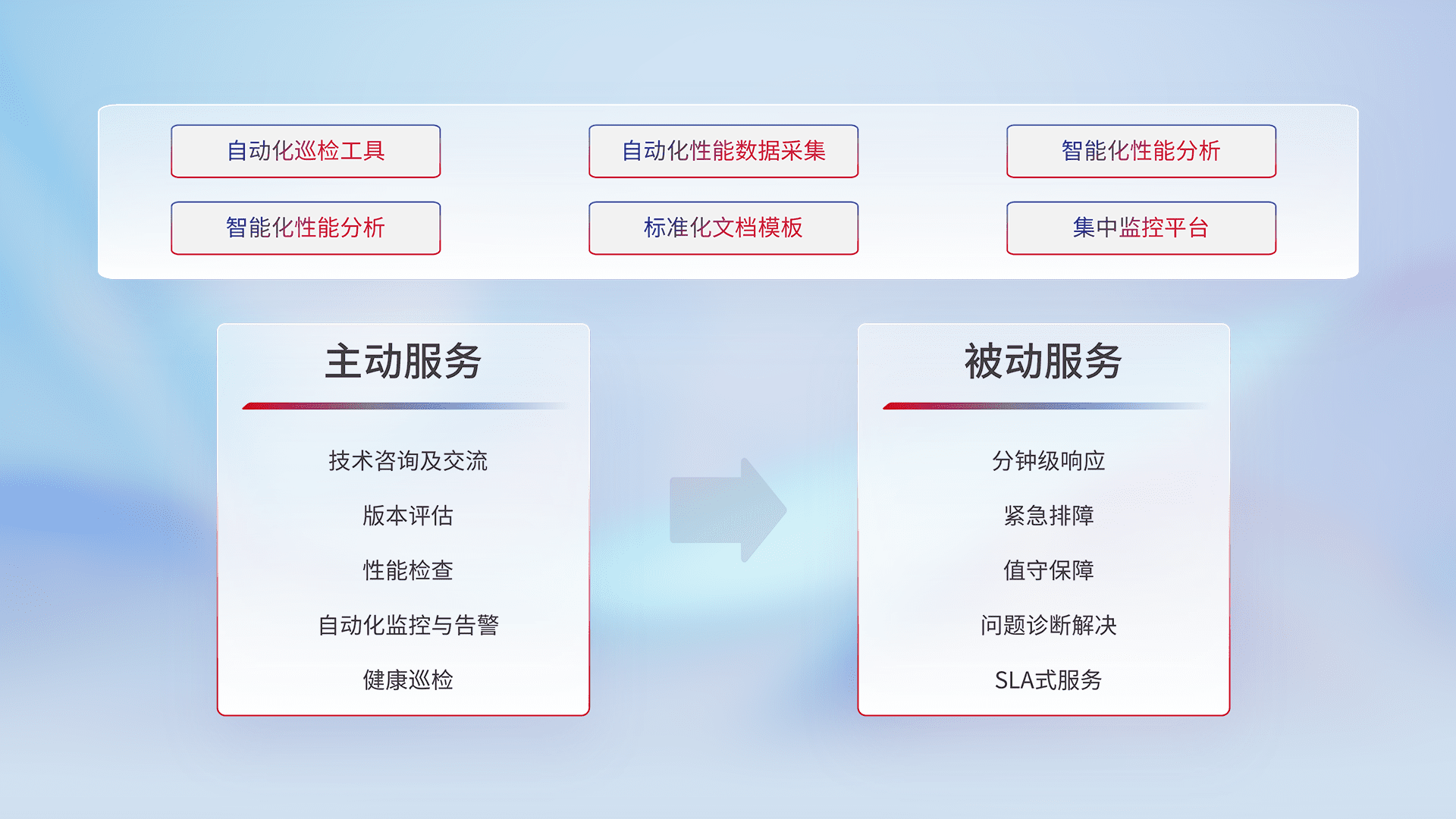 智能化工具和标准化文档,,,,保障服务质量,,提供主动服务(包含技术咨询、、、版本评估、、、、性能检查、、、自动化监控与告警、、、健康巡检)和被动服务包含(分钟级响应、、紧急排障、、值守保障、、问题诊断解决、、SLA服务)。。。。